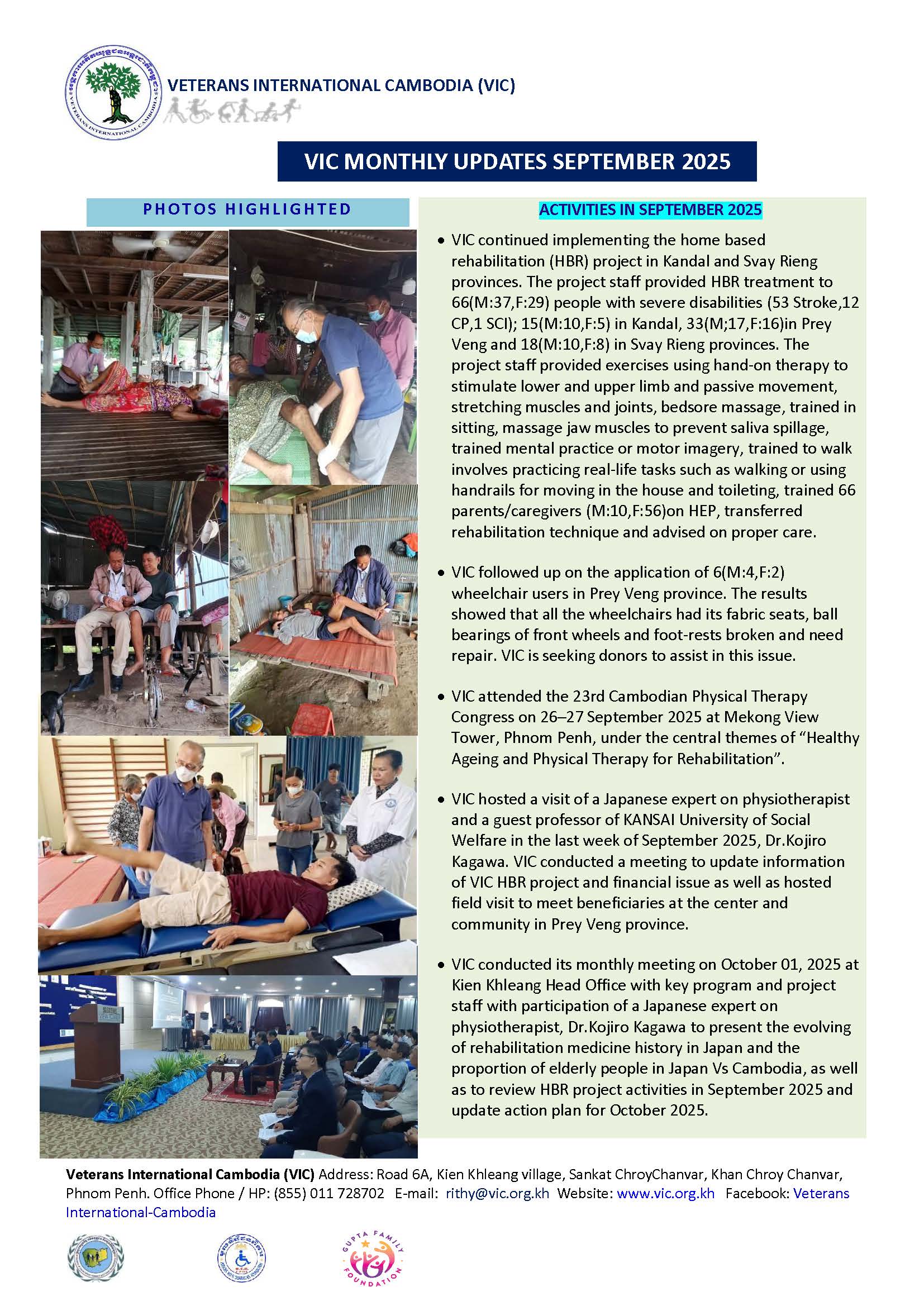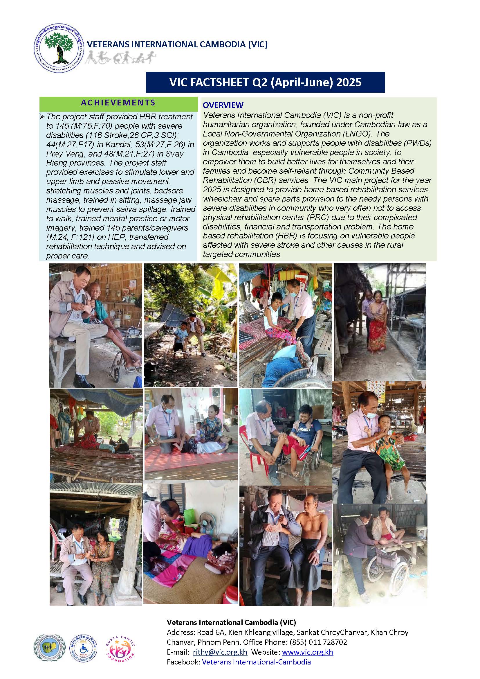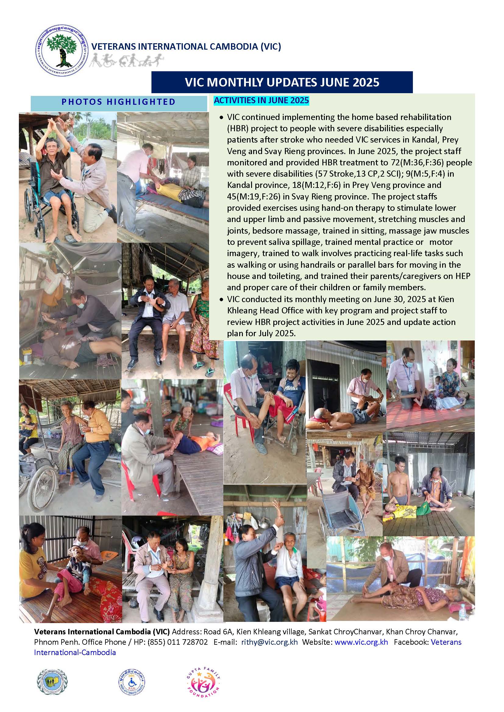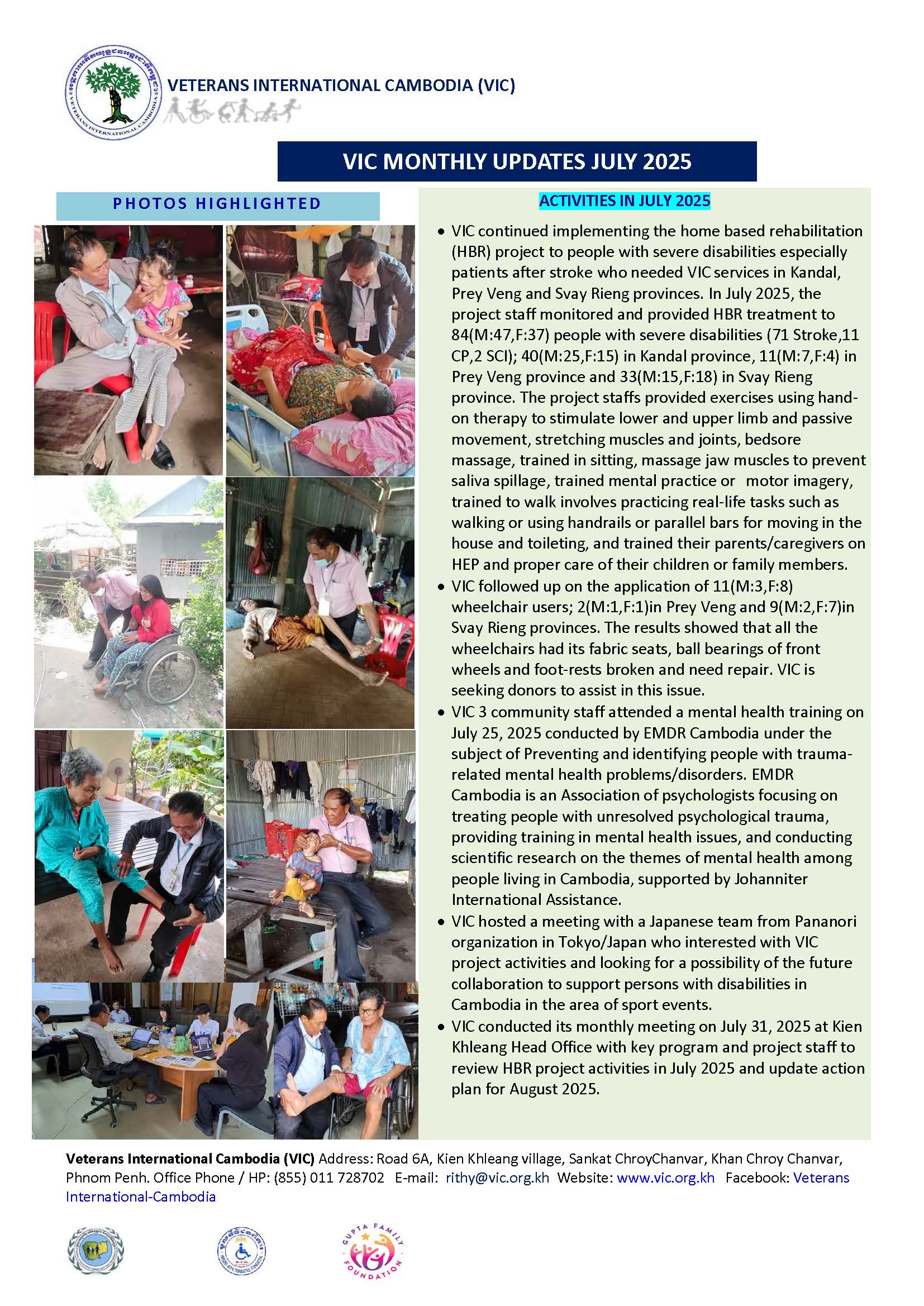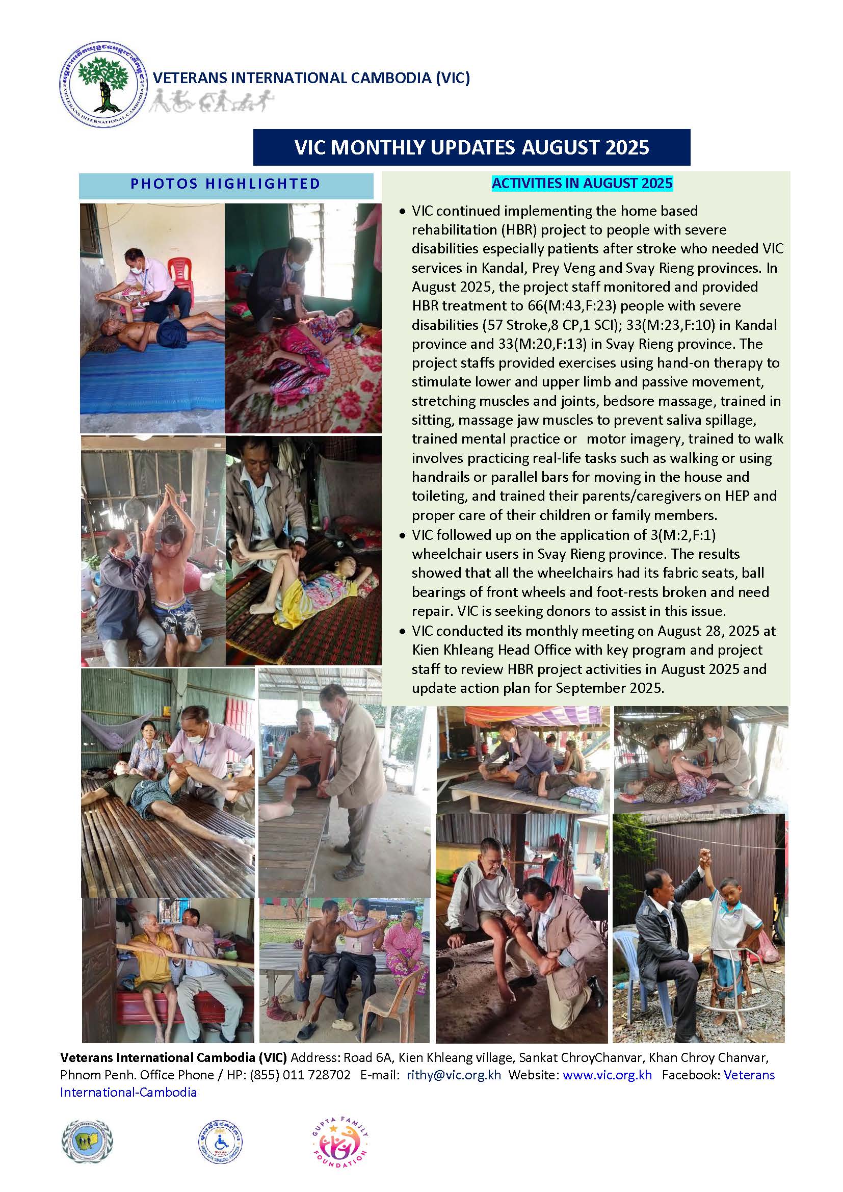 Veterans International Cambodia (VIC) is a non-profit humanitarian organization, founded under Cambodian law. VIC began its programs in Cambodia in late 1991 to provide rehabilitation services for persons with disabilities (PWDs). From July 2014, VIC became a local NGO registered with the Ministry of Interior. VIC continues its mission on wheelchair production, distribution, and operates its CBR programs in targeted communities. The wheelchair production applies new and existing technologies in innovative ways to help overcome barriers and promote the human rights of wheelchair users. This program also provides the means for wheelchair users to enjoy better health and to achieve full and equal participation in society.